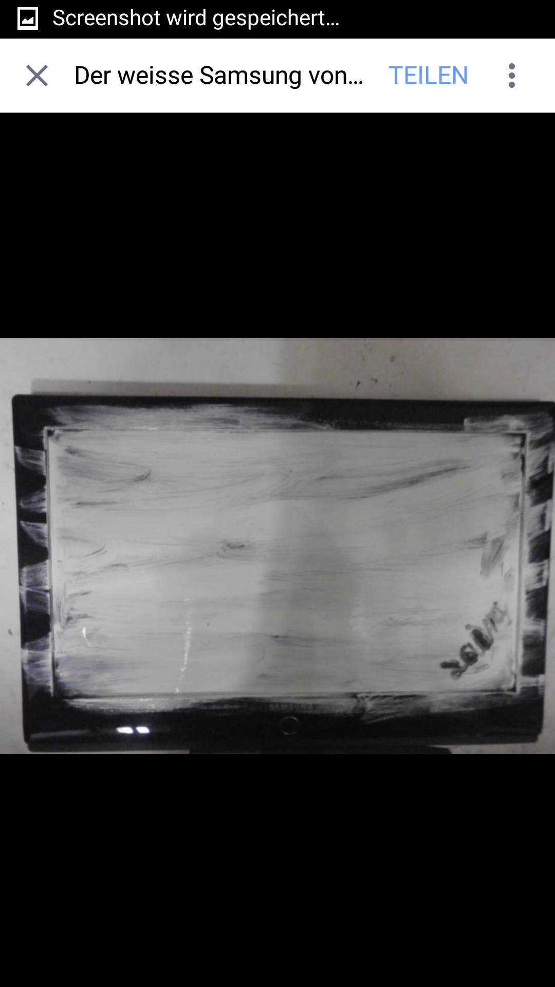 Das Ergebnis war mal in Papas Heimwerkerschrank zu wühlen – da ist immer was drinnen mit dem sich etwas reparieren lässt ! Gesucht ,gefunden!Warum nicht den kleinen , unbedeutetenden Riss mit etwas schwarzer Farbe überpinseln ? Suuuuuper! Einstein lässt grüssen! Nur leider war es weisse Heitungsfarbe (schnelltrocknend).Vielleicht lag es an den Ausdünstungen der Lösungsmittel die Laura nun in eine Art „Rausch“ versetzten (keine Bange sie ist OK) und sie nun dazu bewogen den ganzen Bildschirm weiss zu überstreichen.Schick!Grandios!Das Ergebnis ist nun eine Art modernes Kunstwerk das seines Gleichen sucht ! So entspannend anzusehen ! Ein weiteres Ergebnis war das wir 2 Monate lang wieder mit einem Röhrenfernseher TV gucken durften und jeder sich fragte ob er mal zum Sehtest müsse weil er so unscharf sieht!