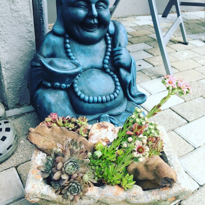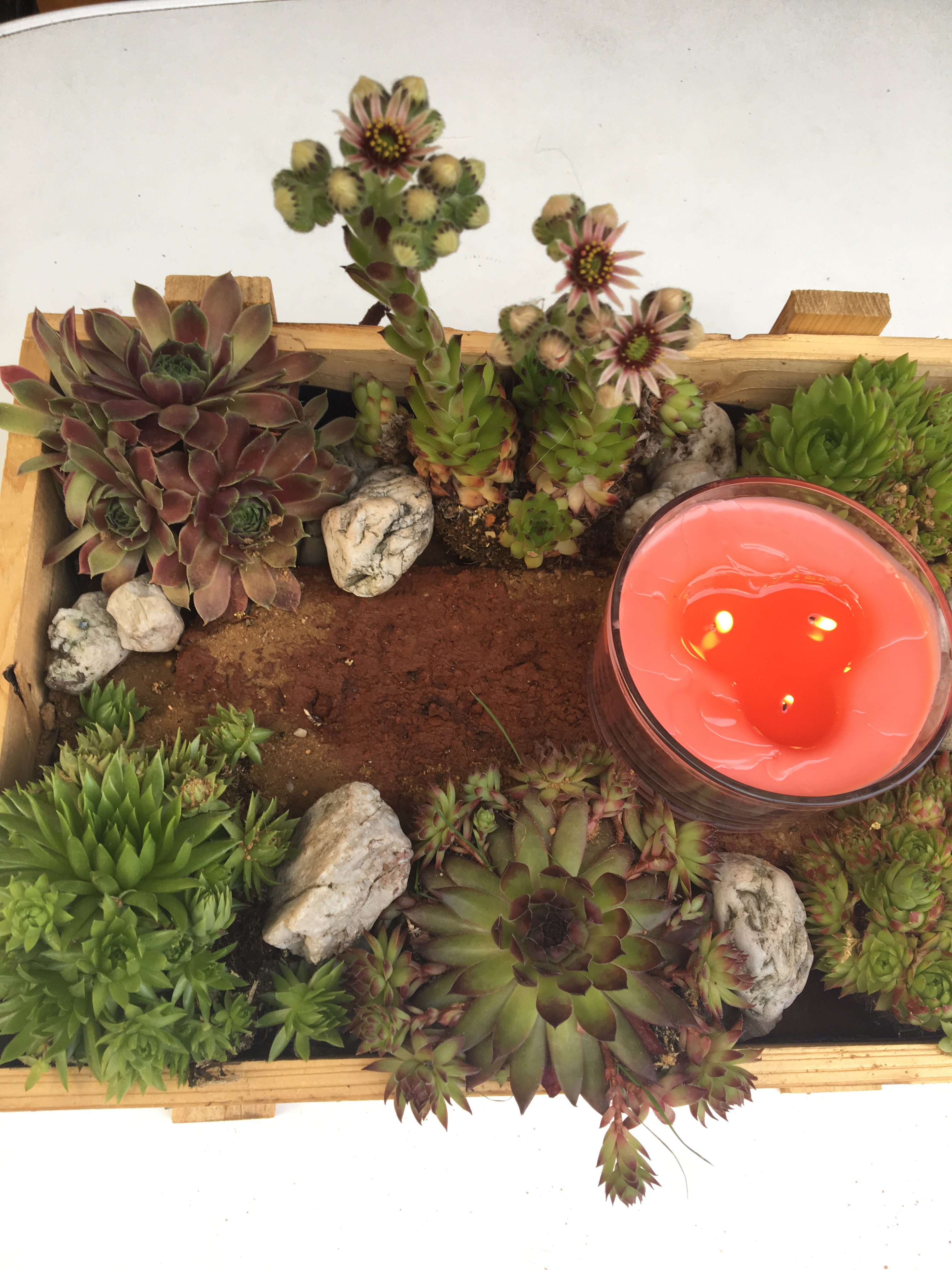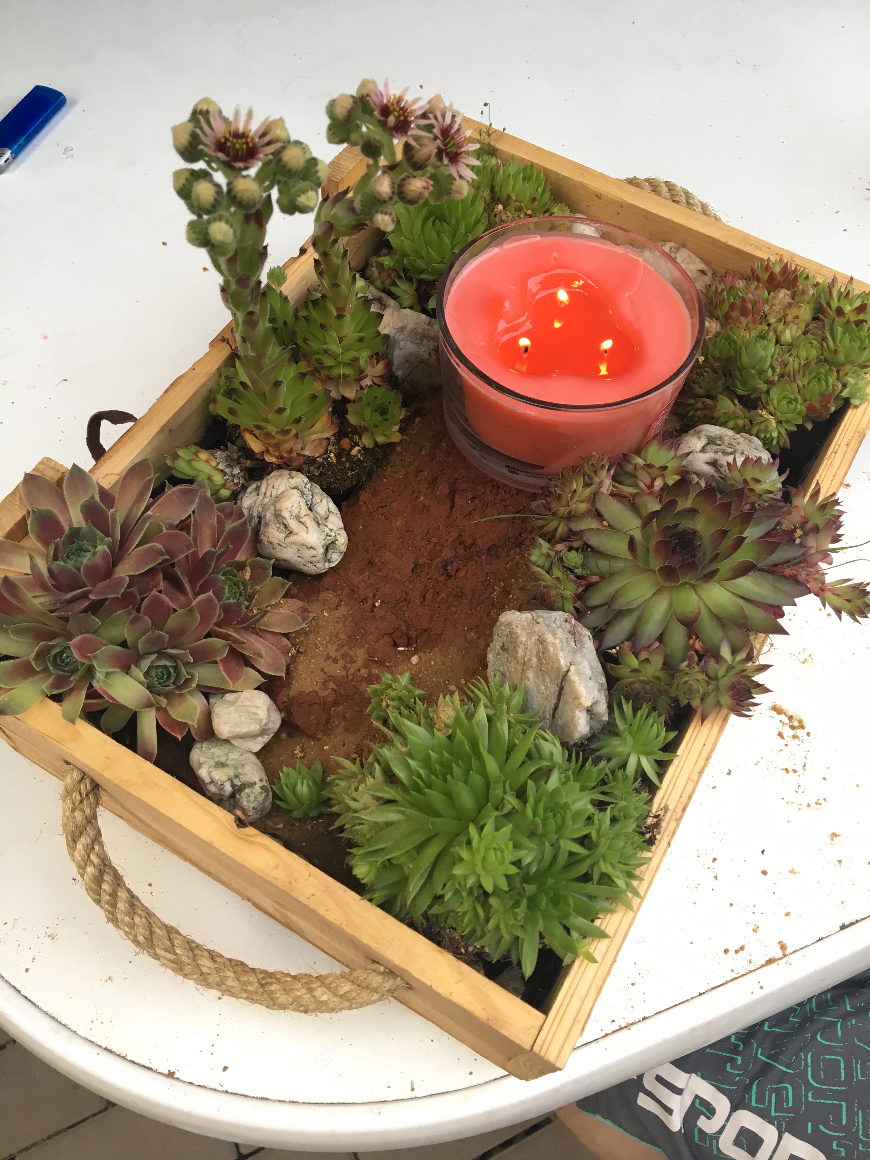 Mini Garten Ganz einfach und günstig. Holzkiste mit Teichfolie auskleiden, Sukkulenten und Sand, sowie in die Mitte einen alten Ziegelstein, als Kerzenuntersetzer…. oder als Spielplatz für Legofiguren …… hihihiii Oder so: