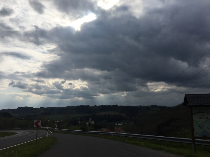 Man könnte meinen, das ist hier. Der Eindruck entsteht jedenfalls, wenn man von einer langen Autobahnfahrt und noch längeren Landstraßenfahrt endlich fast am Ziel ist. Jedesmal wenn ich in den letzten Tagen dann wieder hier ankomme, sehr ich es. Sonnenstrahlen die gebrochen durch die Wolken auf unser Dorf fallen. Jedesmal. Ich kann das Phänomen nicht erklären, vielleicht eine Wetterscheide? Täglich jedenfalls. Außer bei strahlendem Sonnenschein, aber den hatten wir hier mitohne Wolken auch noch nicht.