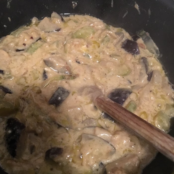 Im Fett das Gemüse anbraten, bis es „schlotzig“ ist. Knoblauch und Schmand unterrühren.