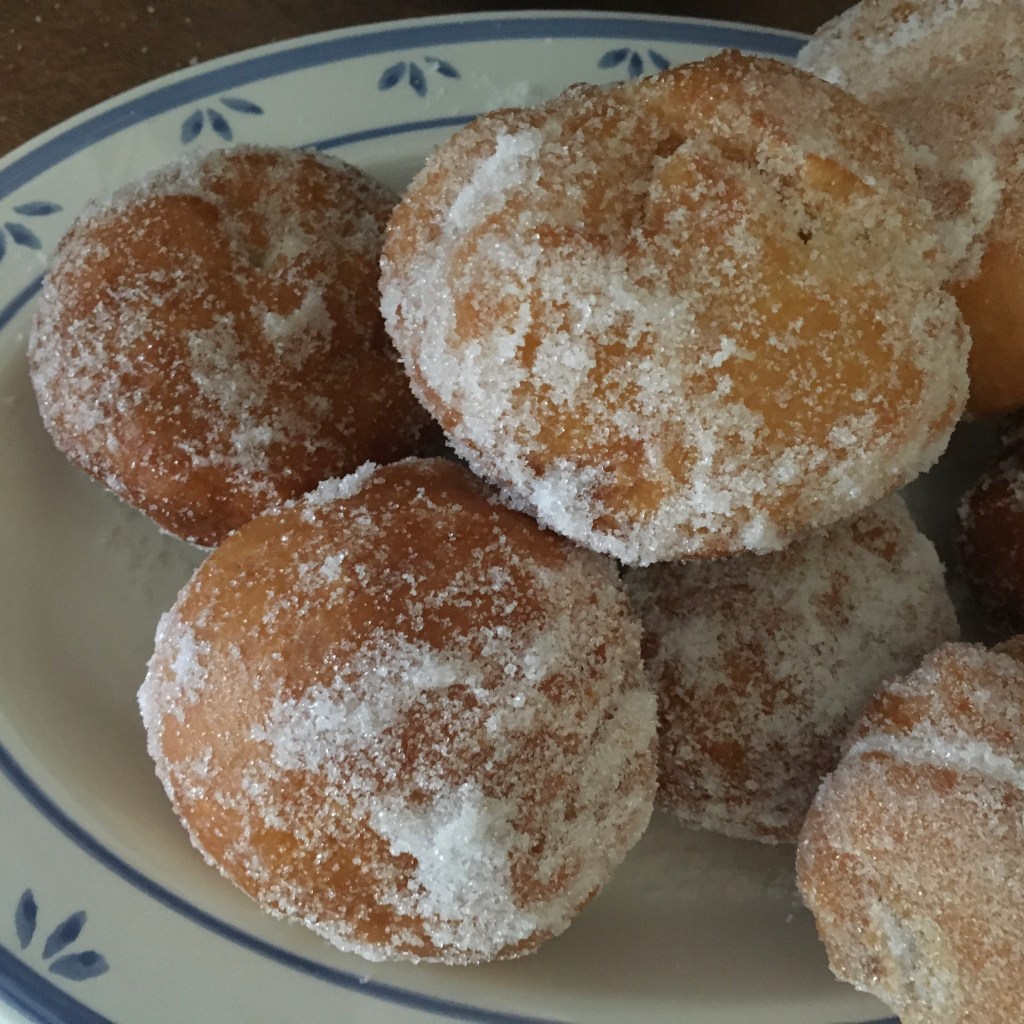 7-10 Minuten frittieren und dann in Zucker wälzen. Ich mische einen Esslöffel Mehl zum Zucker, das absorbiert etwas Fett und spart Zucker