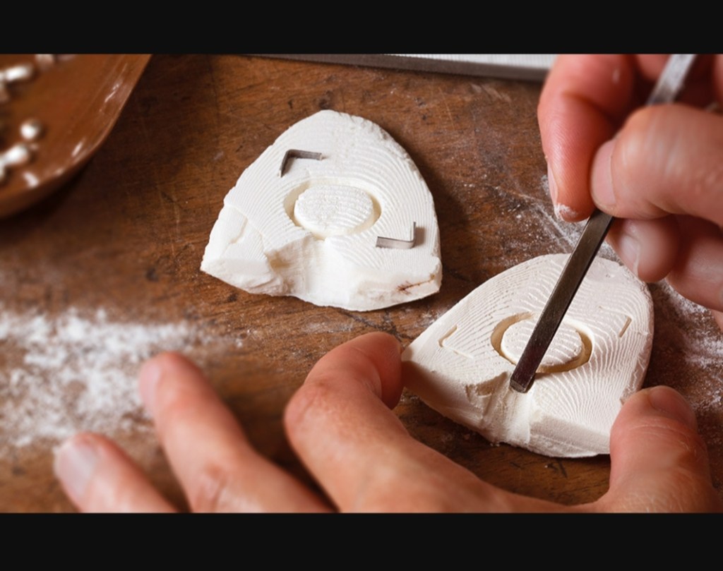 Zwei Sepia Schalen werden auf der weichen Seite bearbeitet und die Form dazwischen gedrückt. Dann wird das Original entnommen und flüssiges Metall in die zwei zusammengebundenen Schalen gegossen. Ich habe es in meiner Lehre ein paar Mal gemacht. Gestank, Dreck und leider am Ende immer ein Werkstück, was ziemlich viel Material verbraucht hatte und immer sehr geschrumpft war. Der Schwund der Originalgröße liegt bei 30%, da die Form ja quasi wegbrennt.