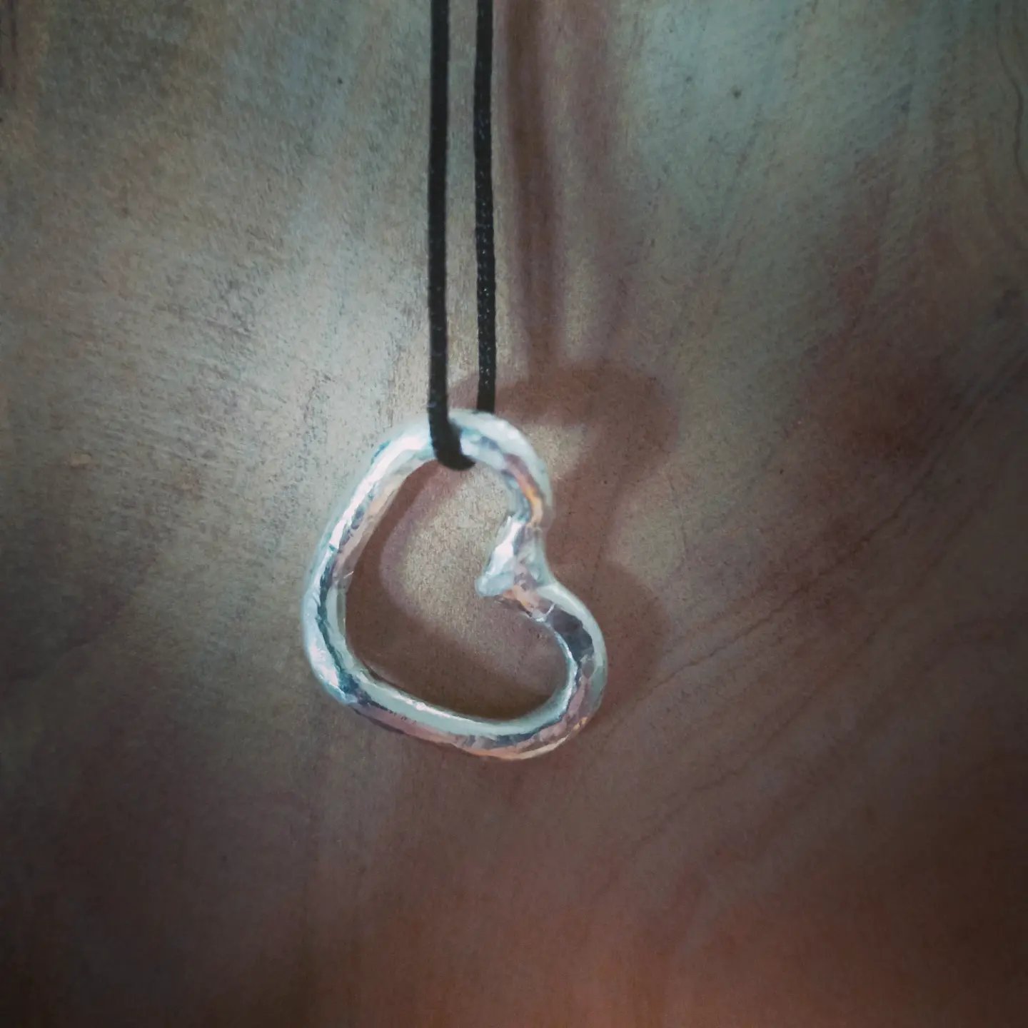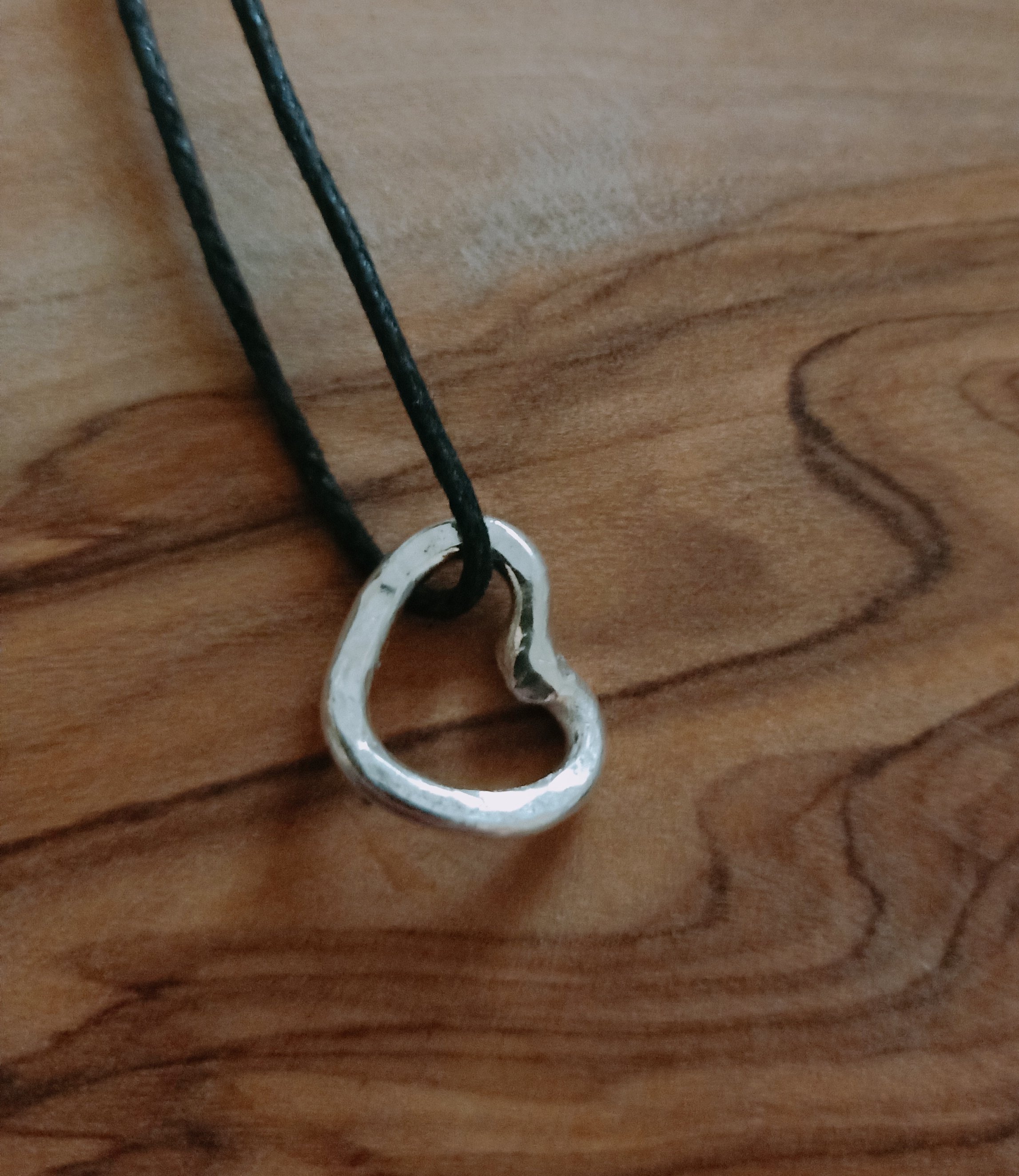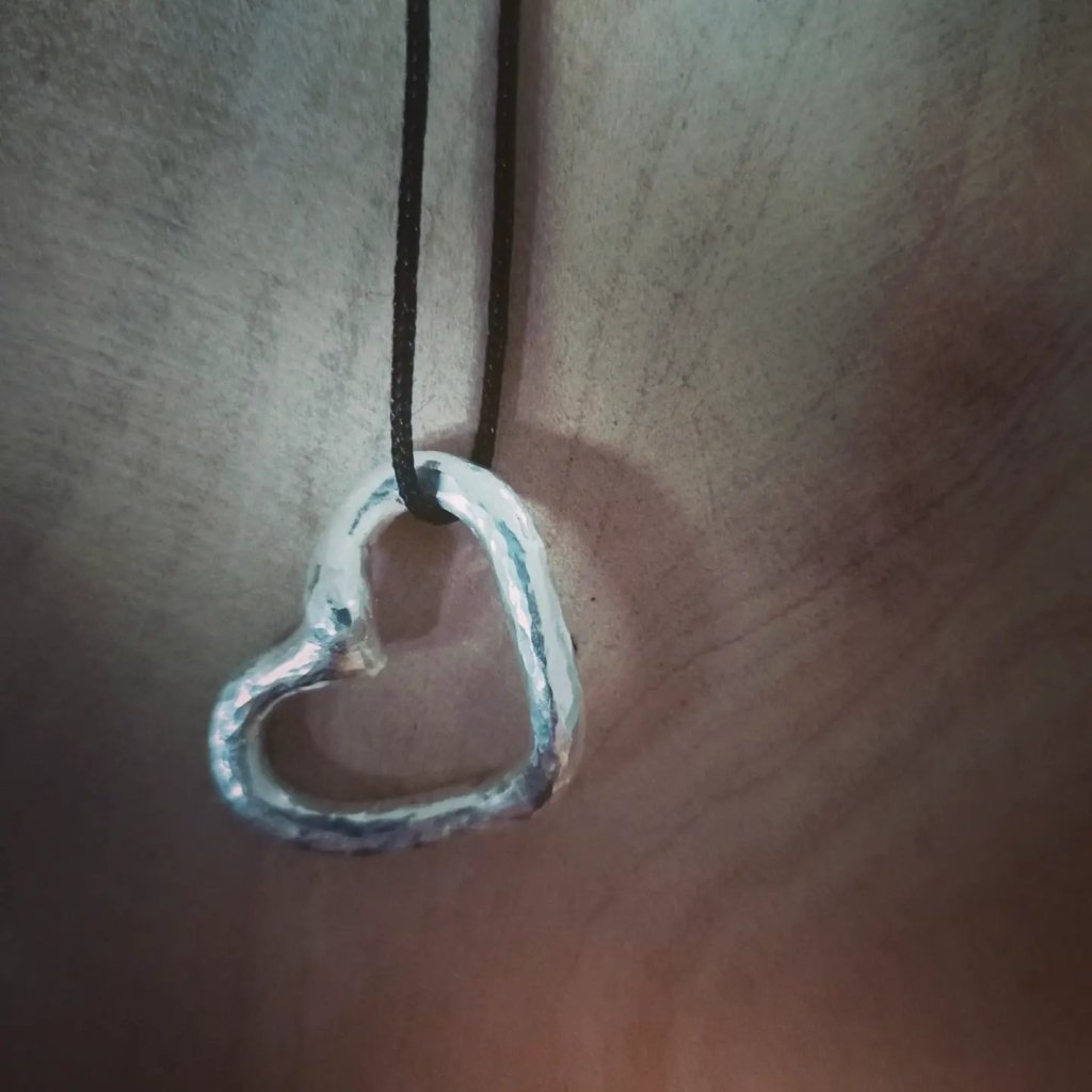 Zum Valentinstag. Noch keine zwei Zentimeter groß. Ein Herz aus reinem Feinsilber. Nachhaltigkeit und recyceltes Material. Handarbeit. Für Kette oder Lederband. Hier an einem 1 mm starkem Baumwollband. Preis, unverbindlich : 25 Euro