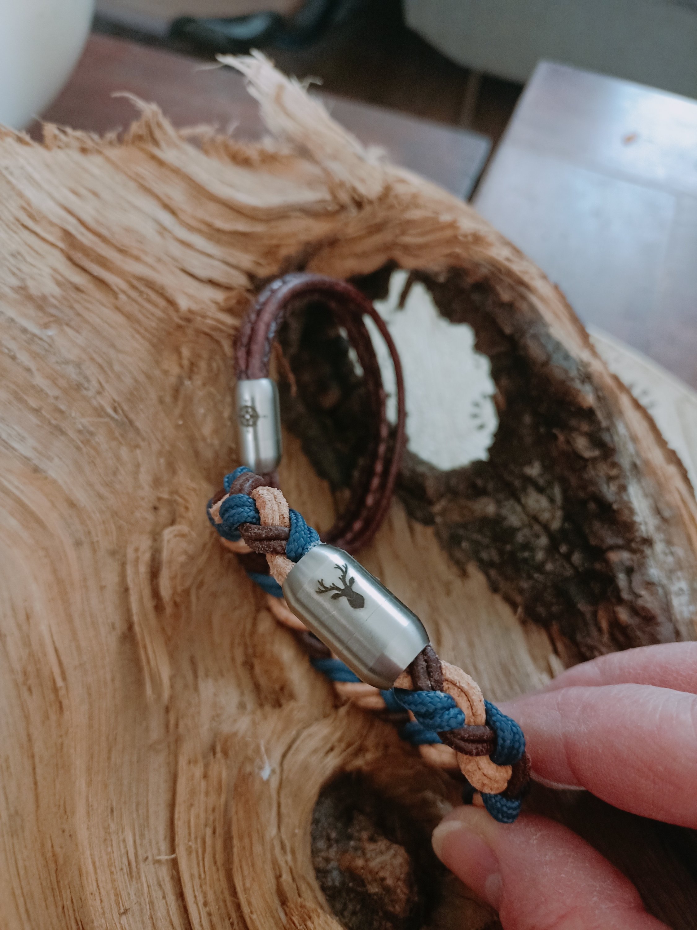 Sowas mache ich übrigens auch. Mit und ohne Feinsilber. Mit Edelstahlverschluss. Oder versilbert. Der Verschluss von dem blauen Segeltauarmband ist versilbert.