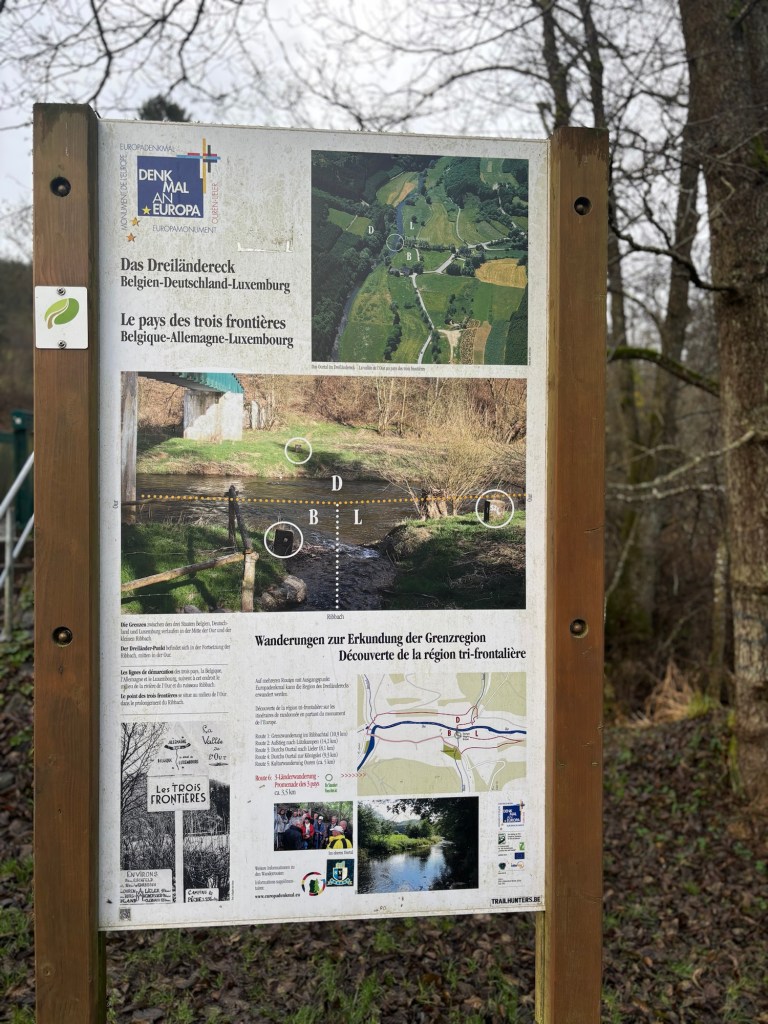 Der Dreiländerpunkt Das ist der Grenzpunkt dreier Länder . Ziemlich in der Mitte der zwei Flüsse, grenzt Belgien an Deutschland und Luxemburg.