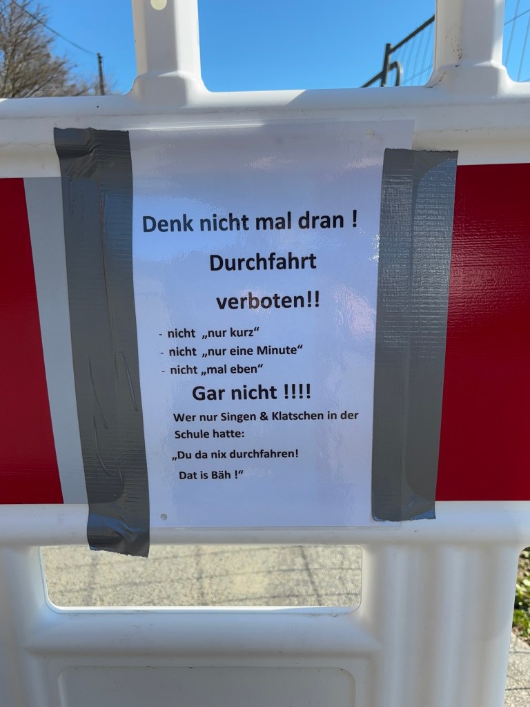 Der Fluss hat die Strasse seit Jahren unterspült- sie muss komplett saniert werden. Die Straße nach Belgien? Zu. Einfach zu. Als hätte jemand gesagt: „Du kommst hier net rein!“