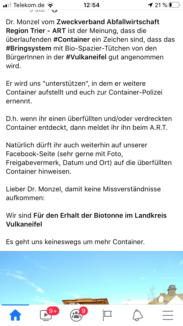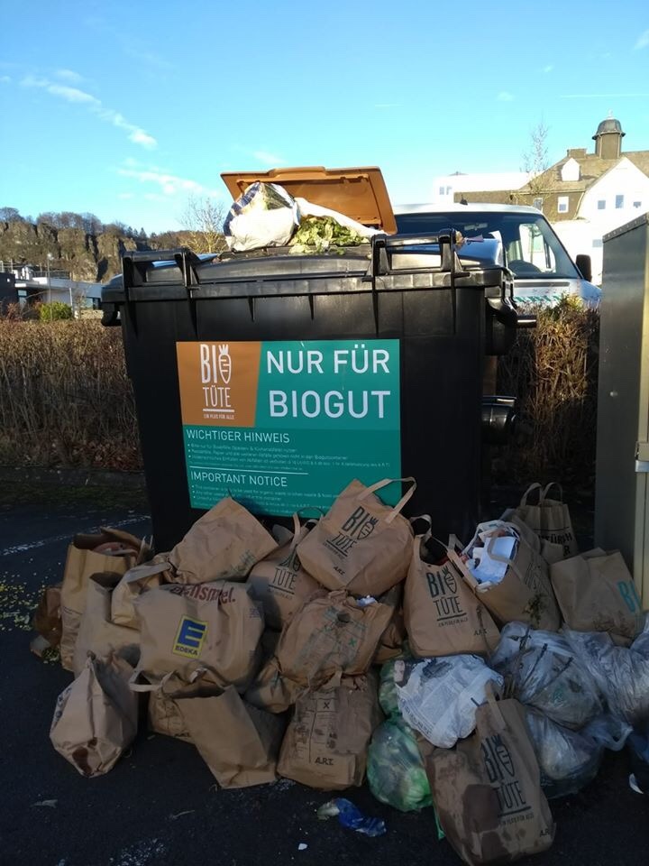 Im Landkreis Vulkaneifel steppt der Bär, oder besser die Sau. Die Biomülltonne wurde abgeschafft und dafür eine ortszentrale Biomülltonne für alle Bürger aufgestellt. Papiertüten an jeden Haushalt verteilt und scheinbar gehofft, dass diese zentral installierten Bakterien, Viren und Schädlingsschleudern auch regelmäßig konsultiert werden. Es ist Winter, da entwickeln sich noch keine Maden und Würmer. Außerdem wird in jeden Haushalt statt vierzehntäglich jetzt alle vier Wochen die Hälfte des normalen Mülls abgeholt. Hat jemand Kinder mit verkackten Windeln soll er im Internet gucken, ob eine Tonne in der Nähe noch Kapazität hat. Falls der Besitzer einer halb leeren Tonne, die dann online stellt! Soweit verstanden? Meine Oma hat kein Internet…..