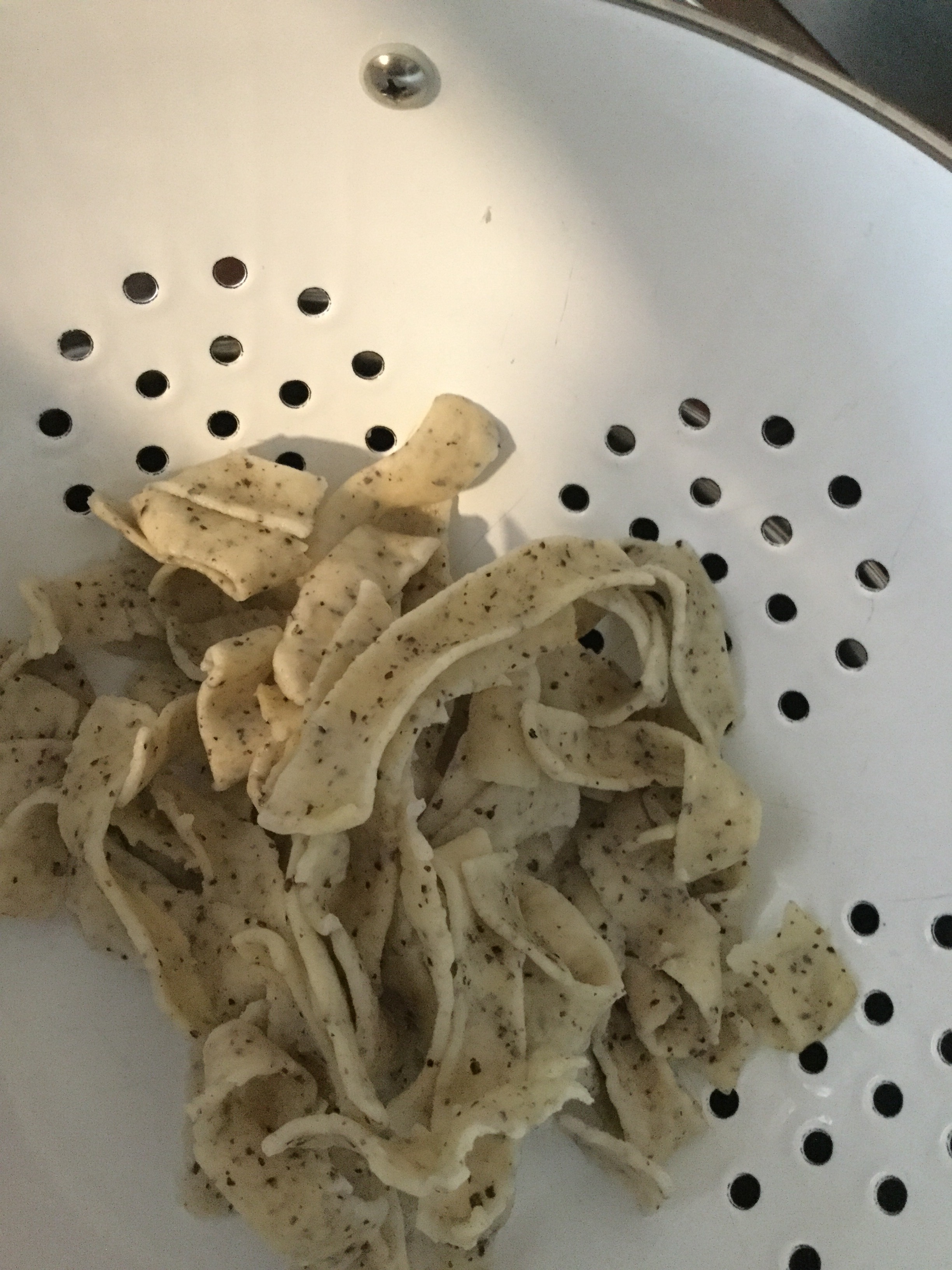 Wer also Mehl im Schrank hat und ein paar Eier, braucht keinen Lieferservice. Nur einen Topf, einen Löffel (wobei ich den Teig mit einem Schaber in Stücke schneide) und ein bisschen Mut zum Klumpenrisiko.