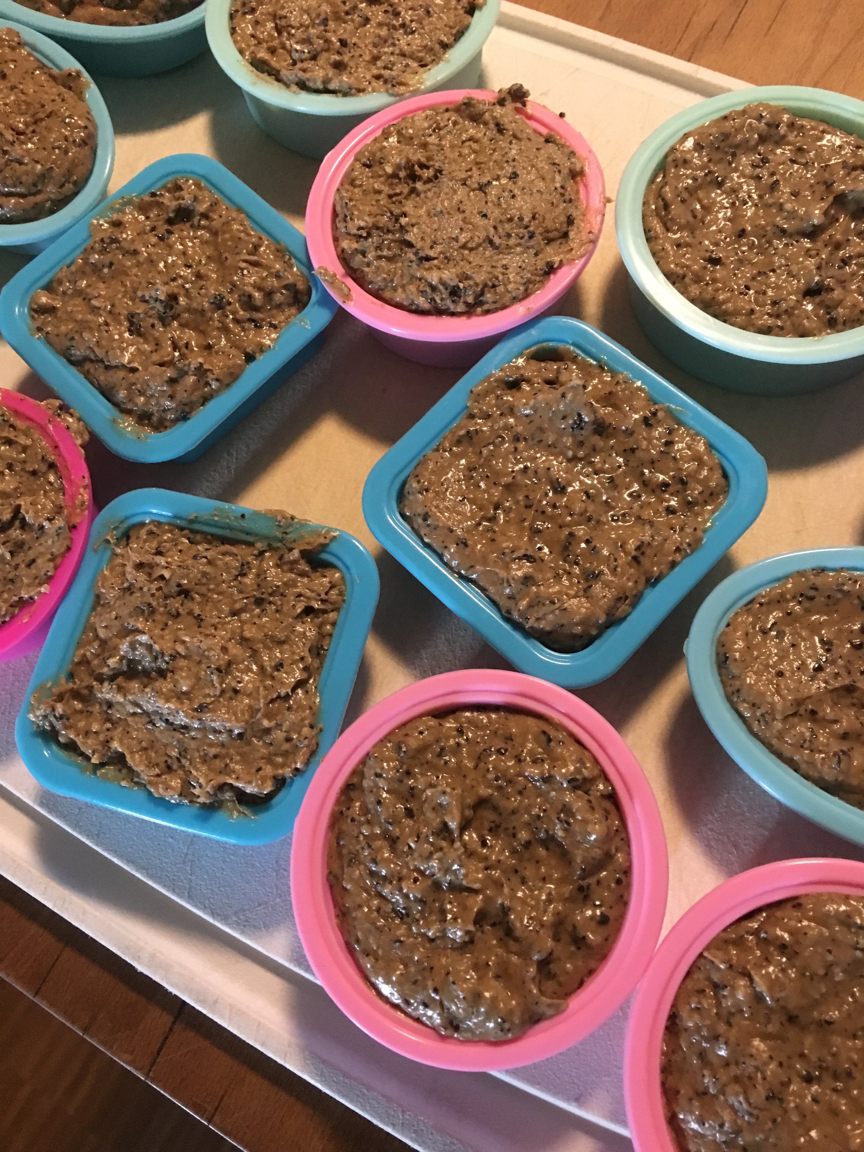 Die Zutaten im Mixer zerkleinern. Das Fett schmelzen. Achtung nicht zu heiss werden lassen, wir wollen ja nichts frittieren!!! In einem Topf alles mit dem heißen Wasser mischen mit dem Pürierstab. Ich gebe vorher die Seife löffelweise in das Fett, dann schmilzt sie ebenfalls schneller . Solange, bis eine homogene Masse entsteht. Mit einer Spritztüte oder mit dem Löffel in die Formen füllen und 30 min einfrieren.